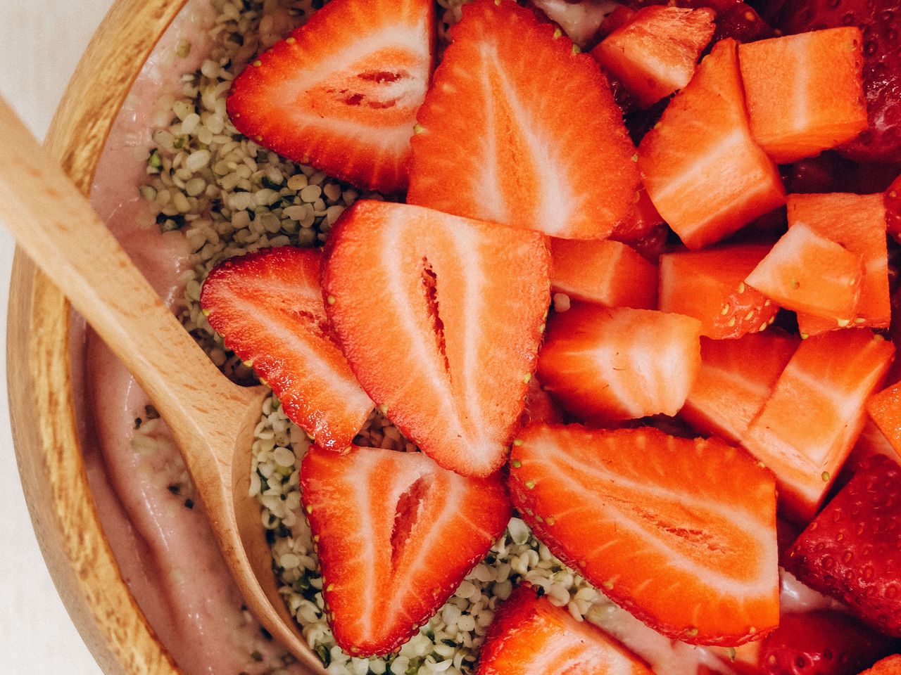 Download 1280x960 strawberries, berries, wedges, nuts, bowl, dessert wallpaper, background standard 4:3