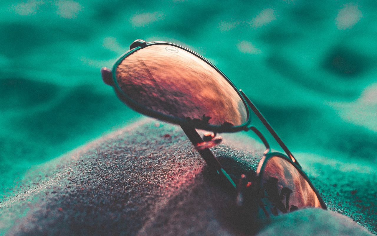 Download 1280x800 sunglasses, sand, close-up, blurred wallpaper, background widescreen 16:10