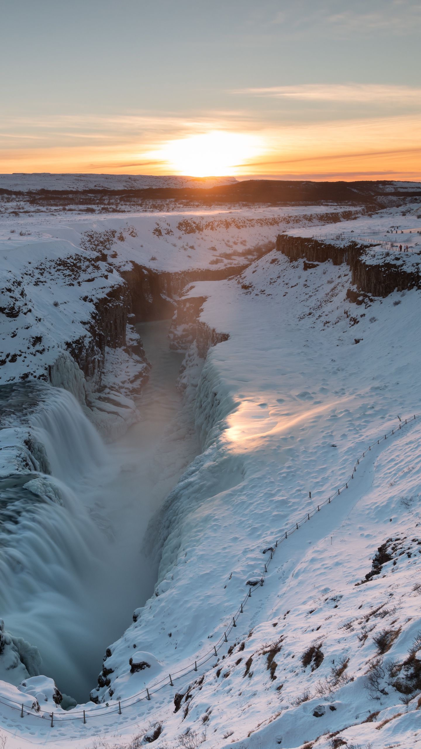 Download 1440x2560 sunrise, waterfall, ice, snow, winter wallpaper, background qhd samsung galaxy s6, s7, edge, note, lg g4