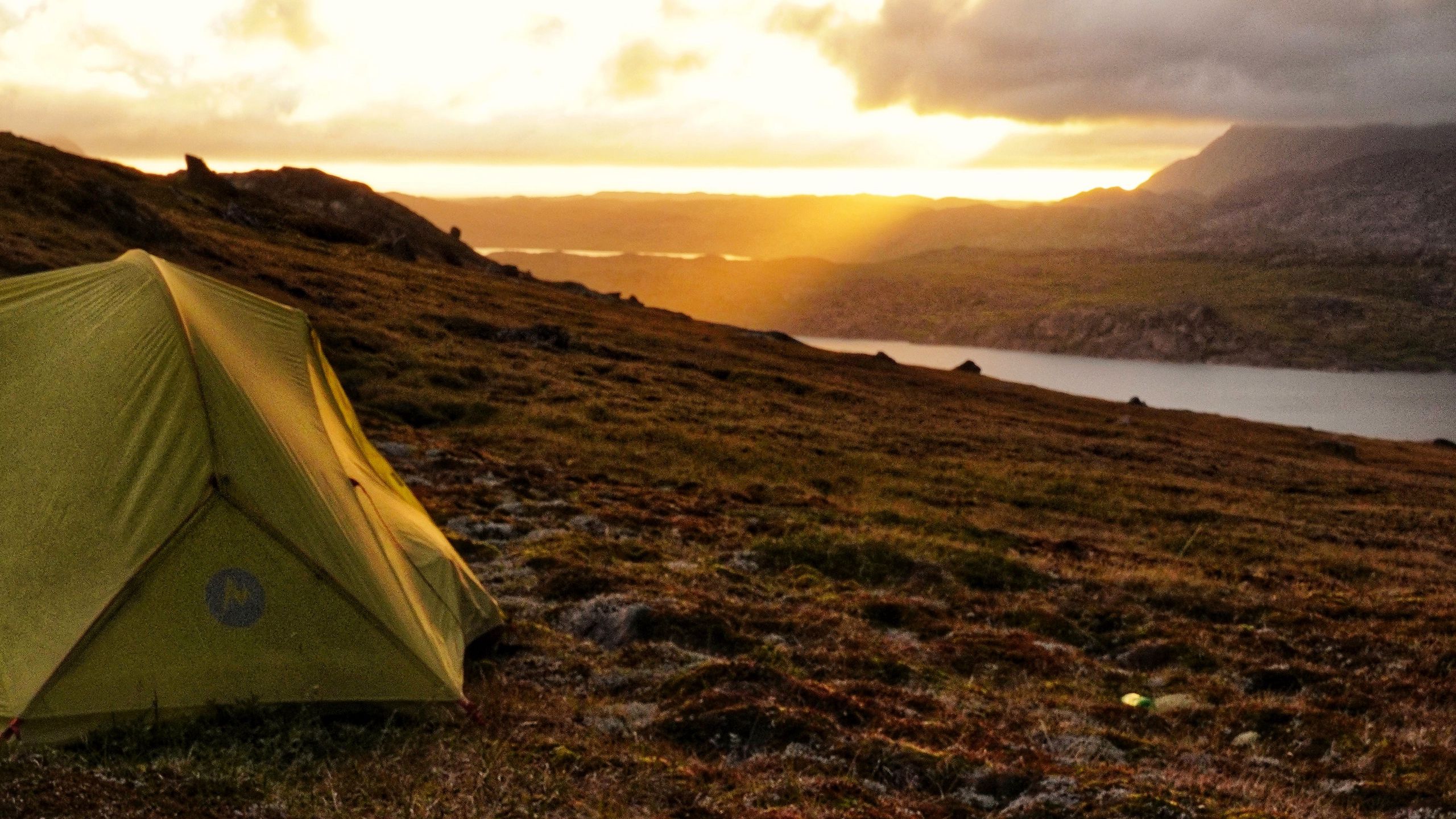 Download 2560x1440 tent, hill, river, clouds, nature wallpaper, background widescreen 16:9