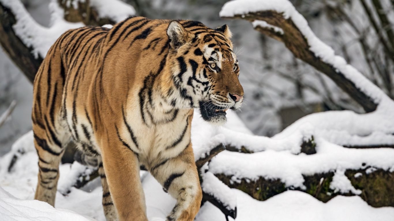 Download 1366x768 tiger, movement, predator, big cat, winter, snow wallpaper, background tablet, laptop