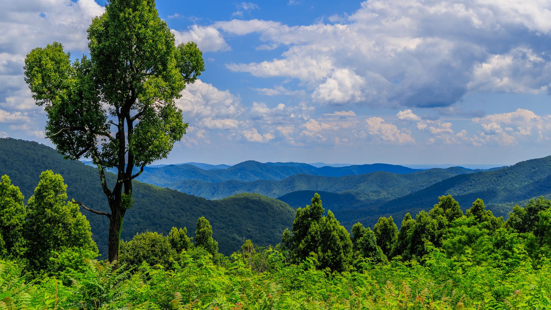 Download 1920x1080 trees, bushes, grass, mountains, clouds, sky, landscape wallpaper, background full hd, hdtv, fhd, 1080p