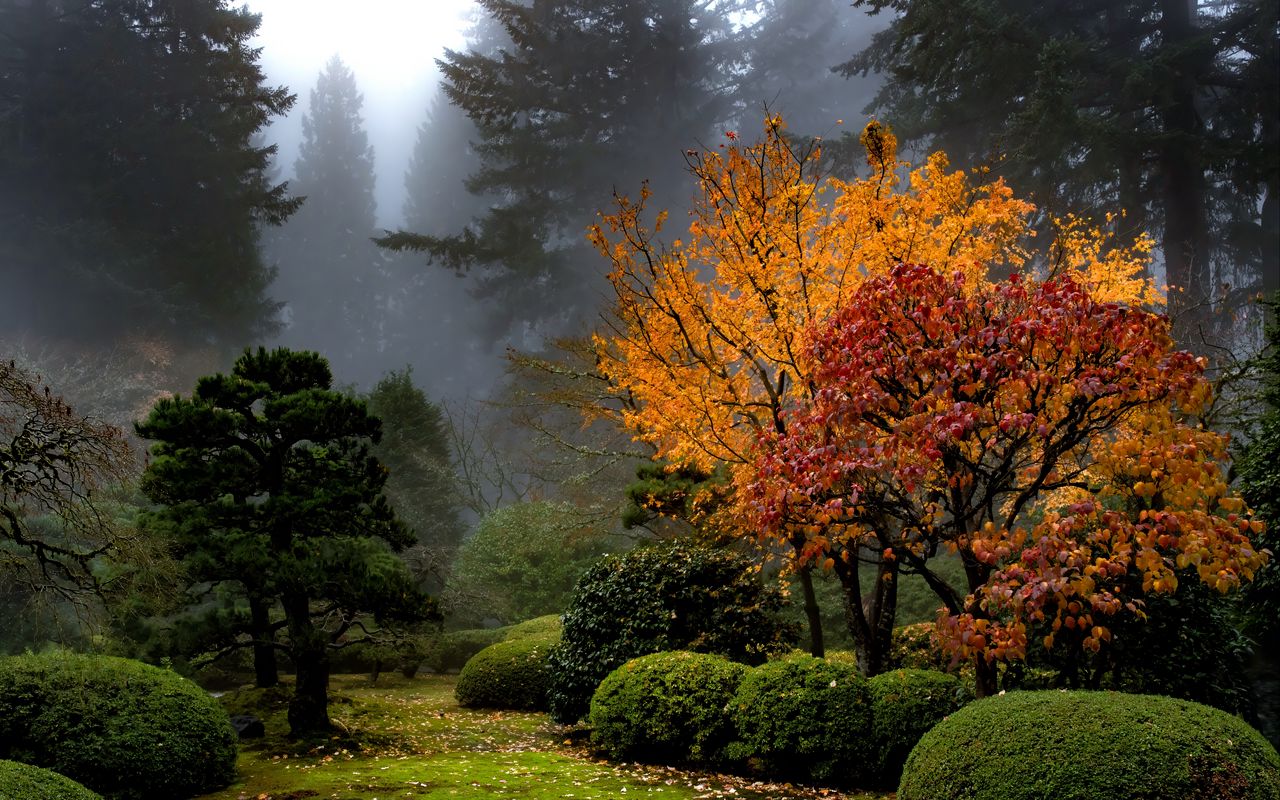 Download 1280x800 trees, garden, bushes, fog, autumn, nature wallpaper, background widescreen 16:10