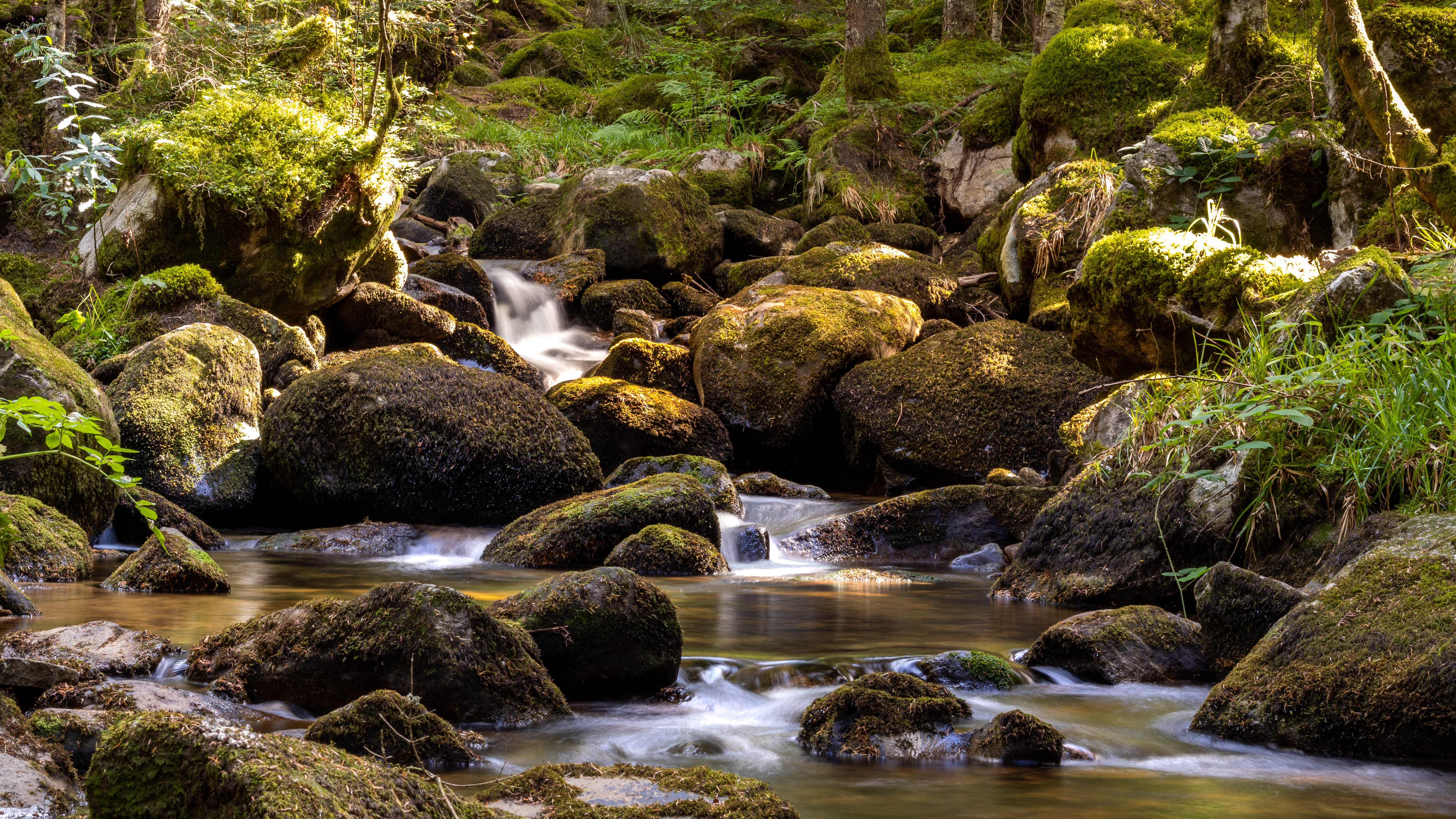 Download 5597x3148 waterfall, flow, stones, moss, blocks wallpaper, background