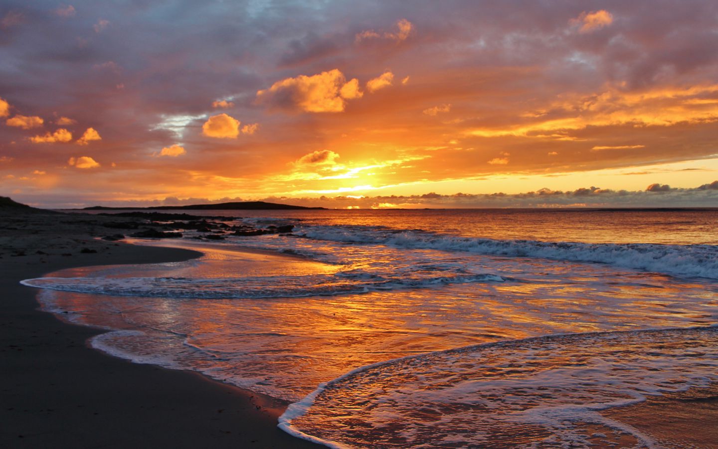 Download 1440x900 waves, foam, sunset, shore wallpaper, background widescreen 16:10