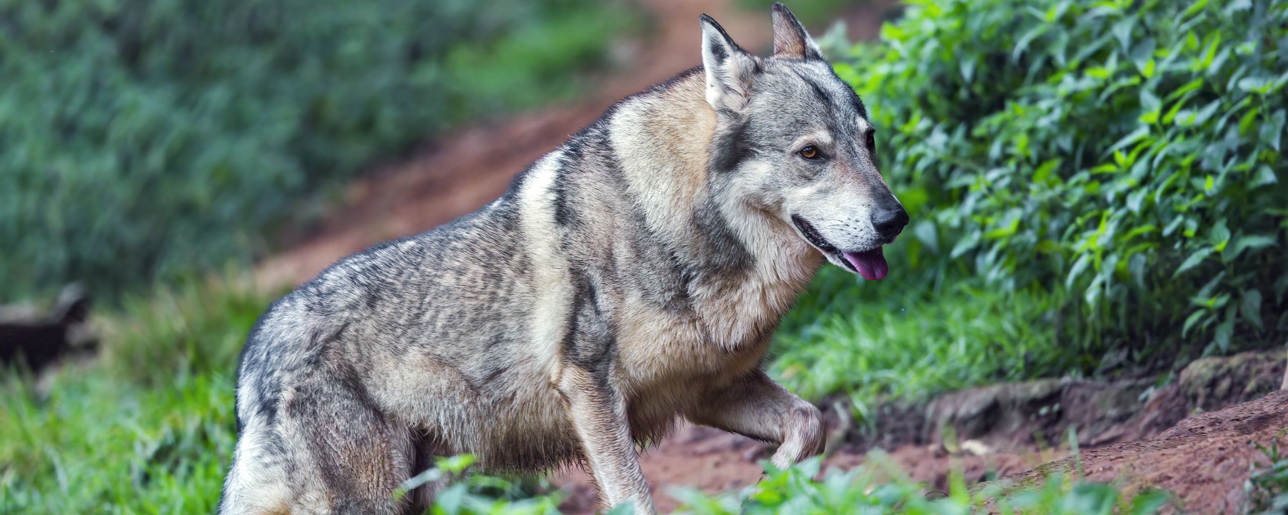 Download 2560x1024 wolf, protruding tongue, predator, wild, grass, slope wallpaper, background ultrawide monitor