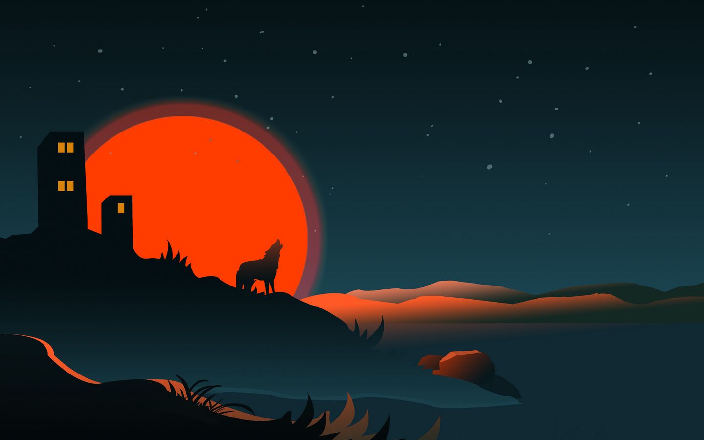 Download 1440x900 wolf, silhouette, building, sun, vector, art wallpaper, background widescreen 16:10