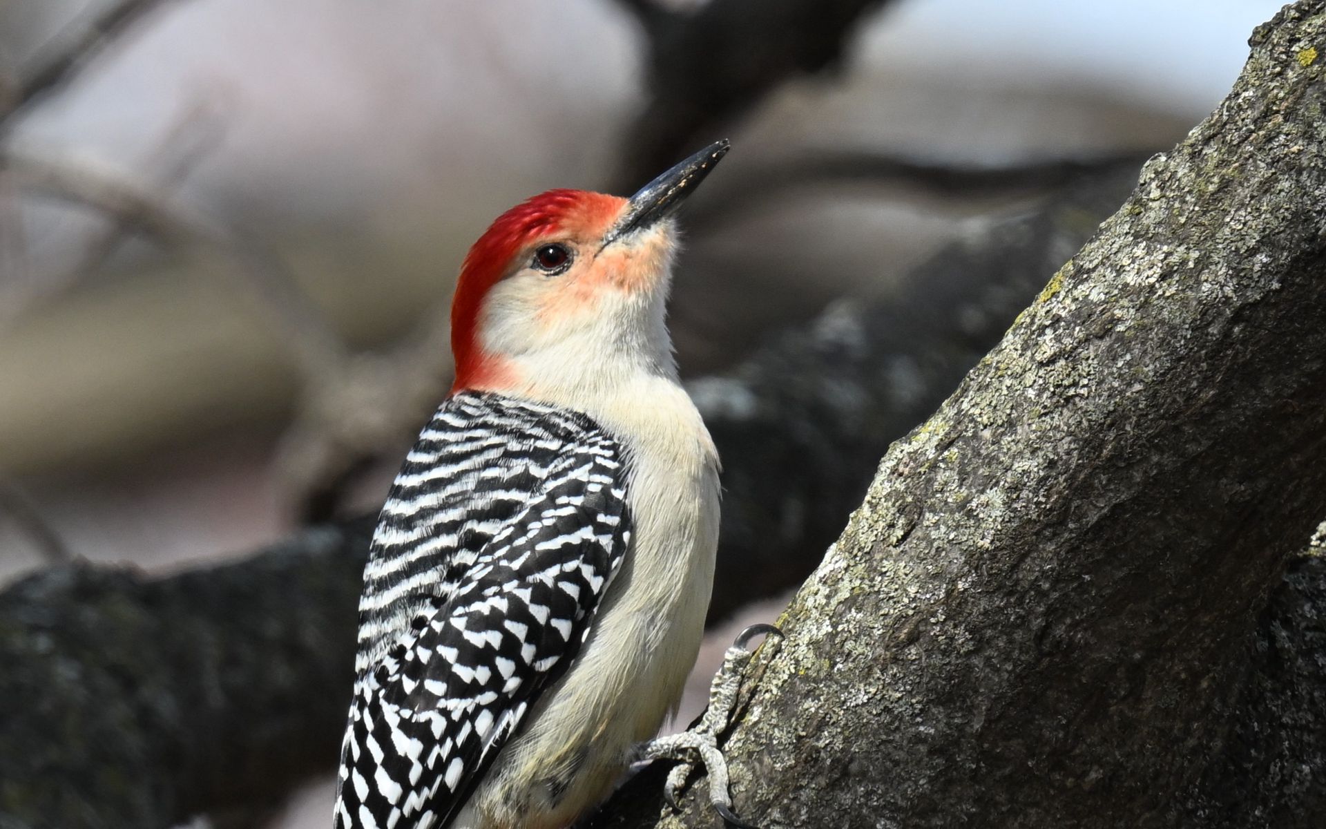 Download 1920x1200 woodpecker, bird, branch, tree, blur wallpaper, background widescreen 16:10